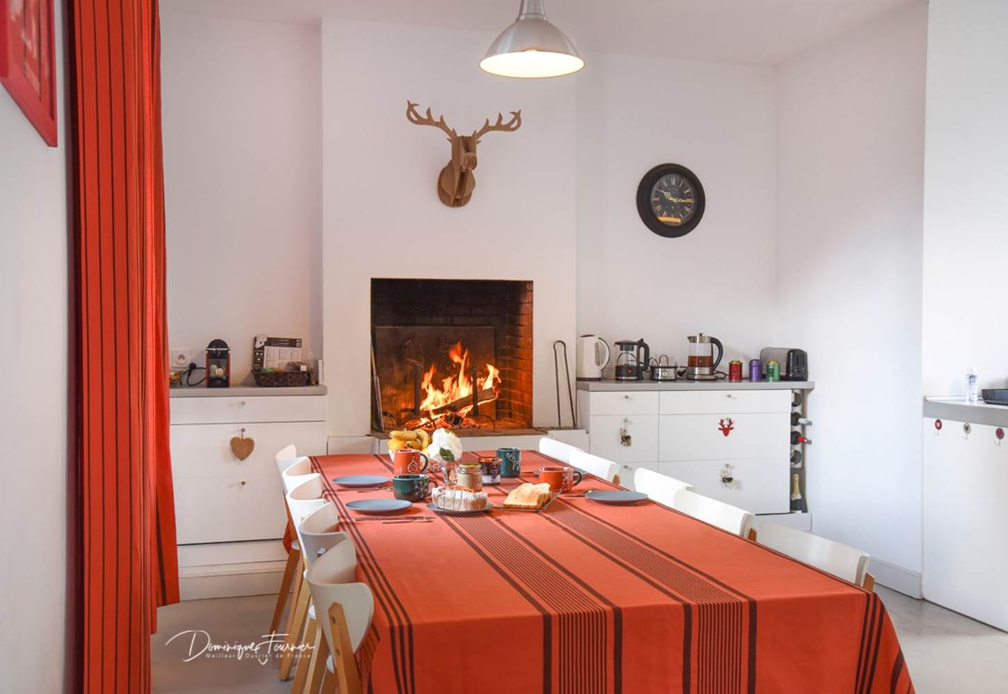 La maison dispose de cinq chambres, d'un vaste séjour organisé en plusieurs espaces salons, et d'une grande cuisine équipée avec cheminée, permettant de partager les repas et les temps de repos après une journée en extérieur.